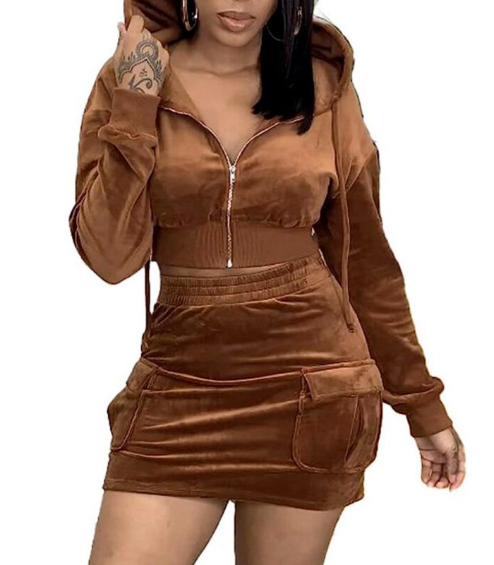 Conjunto de terciopelo para mujer: chaqueta con cremallera y capucha + minifalda entallada. Suave, lujoso y favorecedor para salidas y eventos.