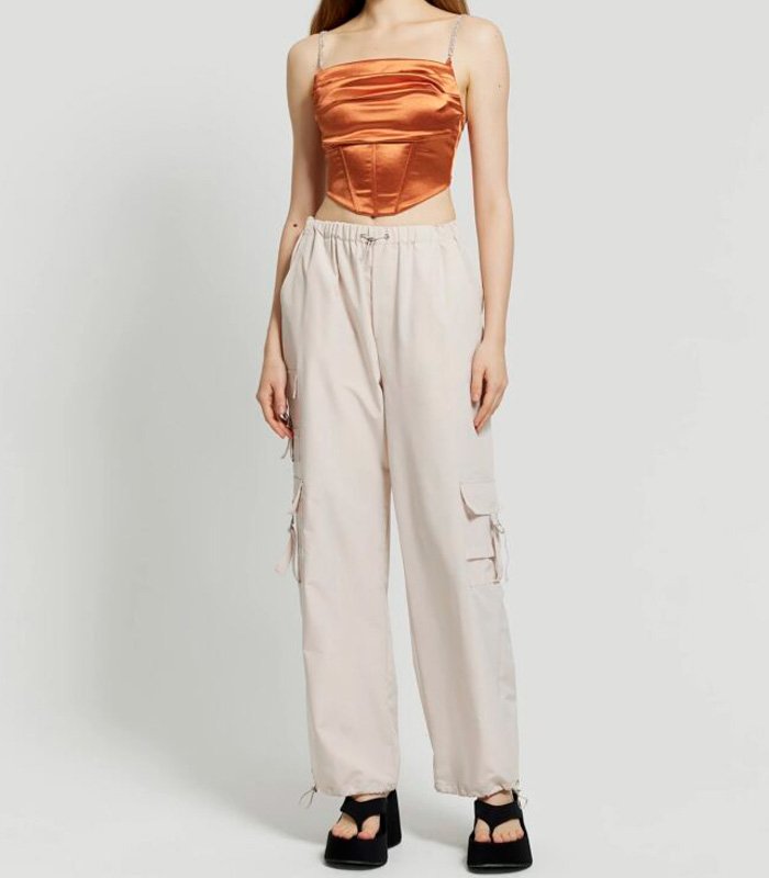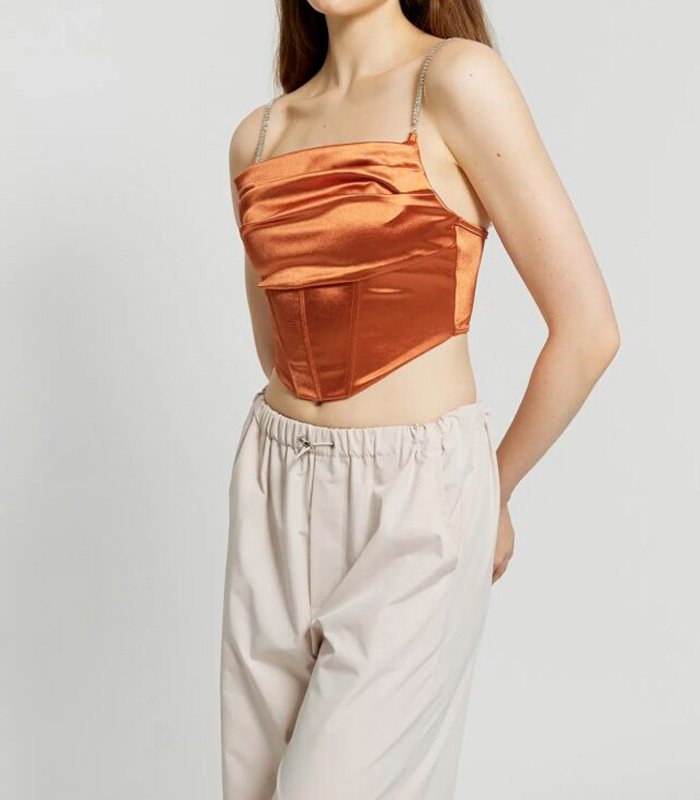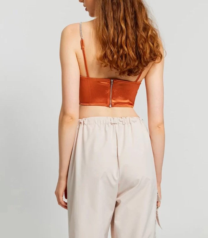 Este corsé de satén de alta calidad realza la silueta con un acabado suave y luminoso. Los diamantes de imitación dispuestos en plisado tipo espina de pescado añaden un toque glam, mientras el corte ajustado y sin mangas estiliza con sofisticación.