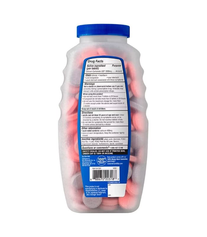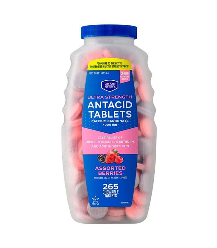 Las tabletas masticables antiácido Berkley Jensen Ultra Strength están formuladas para aliviar la acidez estomacal, indigestión ácida y malestar estomacal. Cada tableta contiene carbonato de calcio, un ingrediente activo utilizado como antiácido.