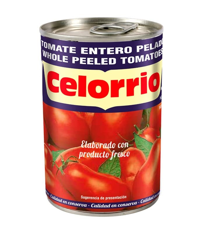 Tomates enteros pelados Celorrio en lata 14.5 oz. Ideales para salsas, guisos y recetas caseras. Naturales, versátiles y listos para usar.