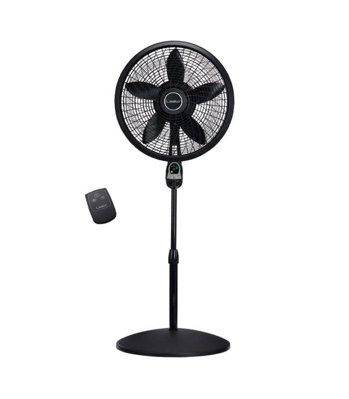 Ventilador de pedestal Lasko 18″ con control remoto, 3 velocidades y oscilación para enfriar espacios de forma eficiente.