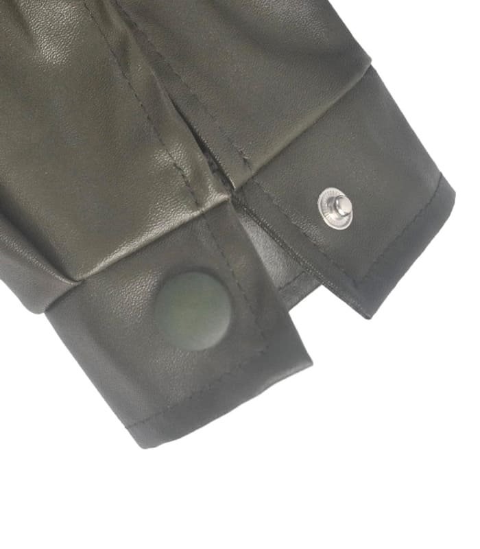 Este elegante vestido de poliuretano combina sofisticación y carácter. Su textura de piel sintética, su cuello en V y sus botones frontales crean una pieza versátil y contemporánea.